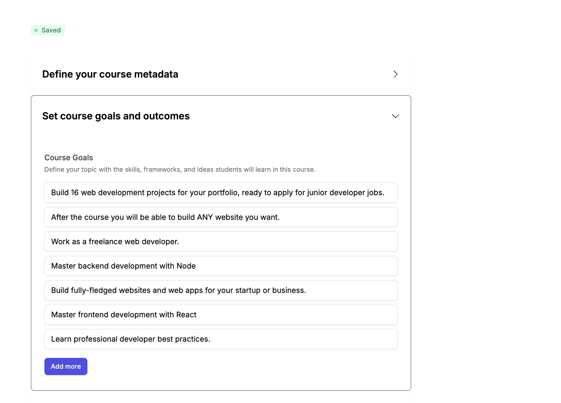 This field shows the date when the course was created (e.g., 30 Sep, 2025). Changing this date will reorder your course on the landing page as well as in your instructor dashboard. This can help highlight newer or updated courses to your audience. All changes are saved automatically in real-time as you edit. We’ll discuss this in more detail later in this guide.Set course goals and outcomes
