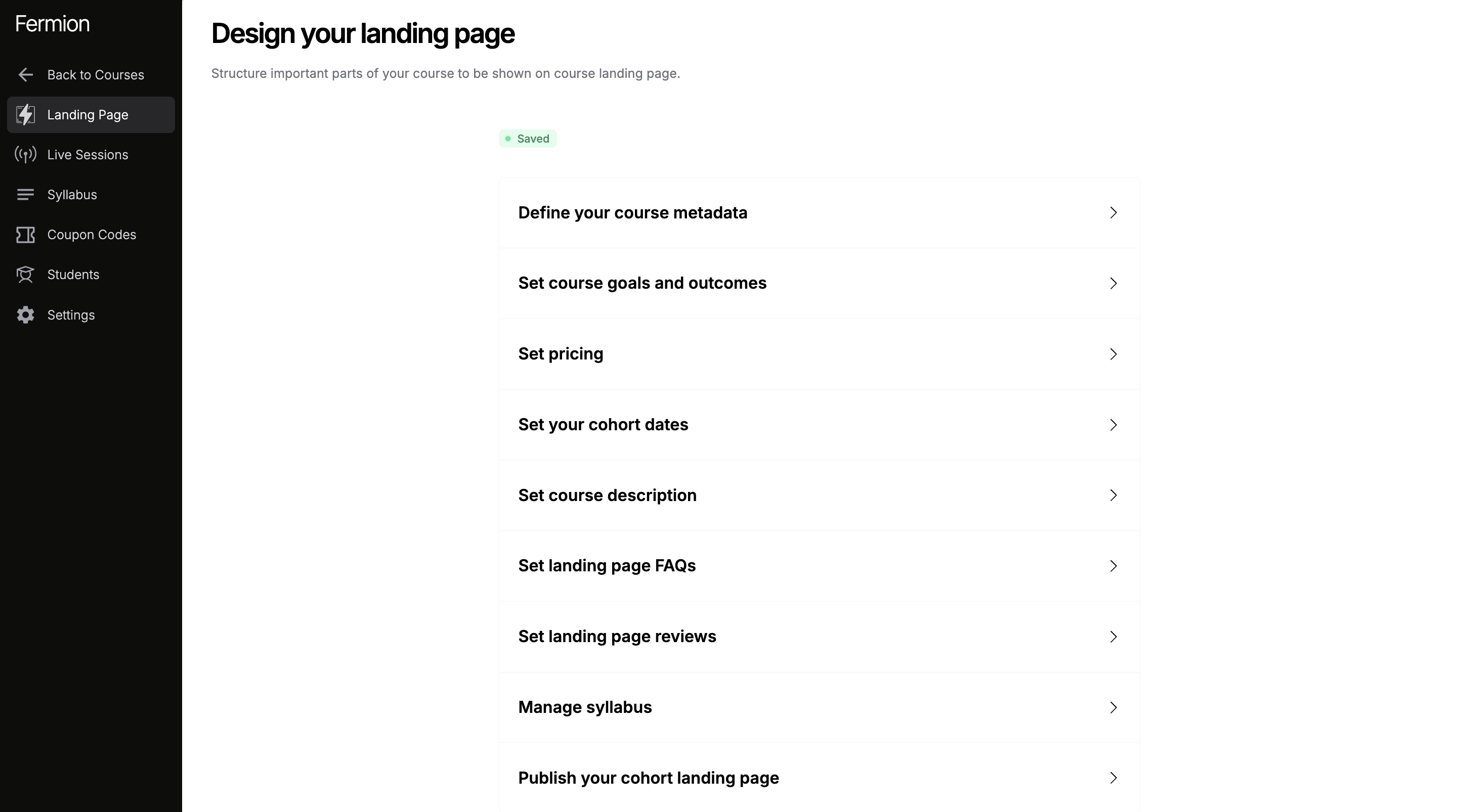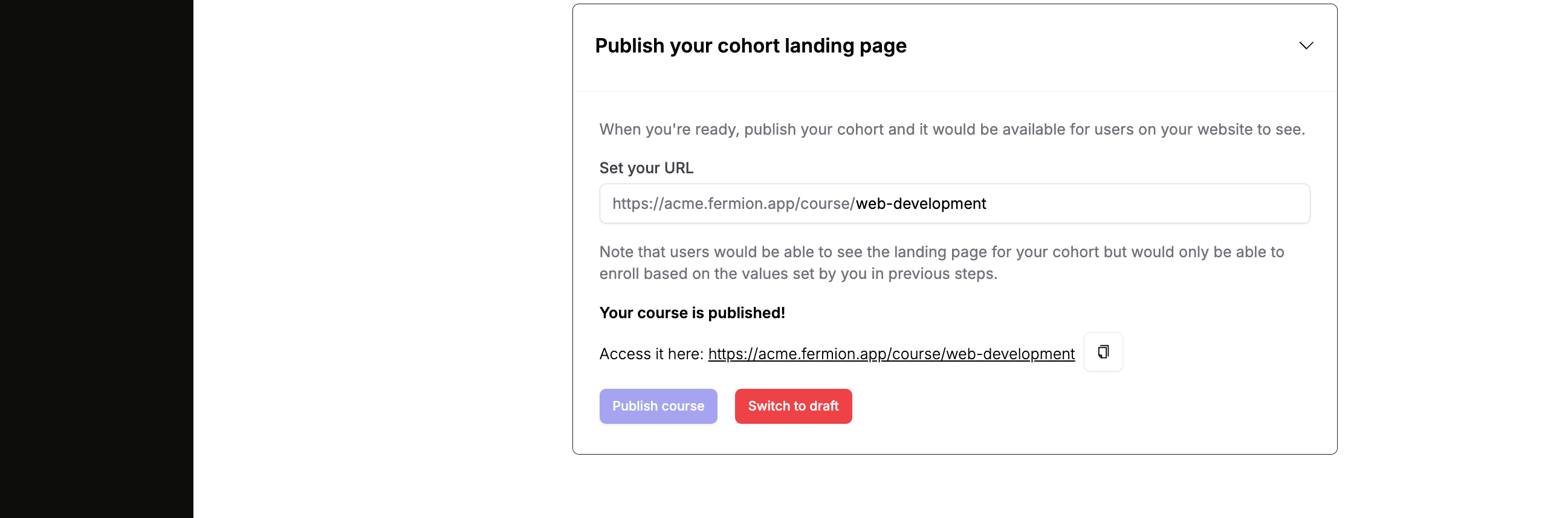 Once you’ve completed your metadata setup, your course landing page is ready for publication.- Draft: Courses in draft state are only accessible to instructors.