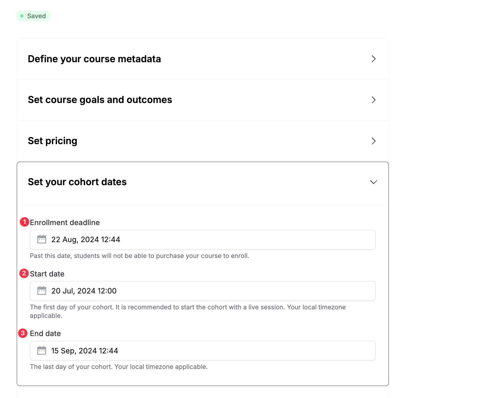Note: This section is only available when you’ve selected “Cohort-Based Course” during course creation.- Enrollment Deadline - The final date when students can register for the course.
